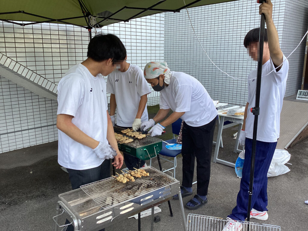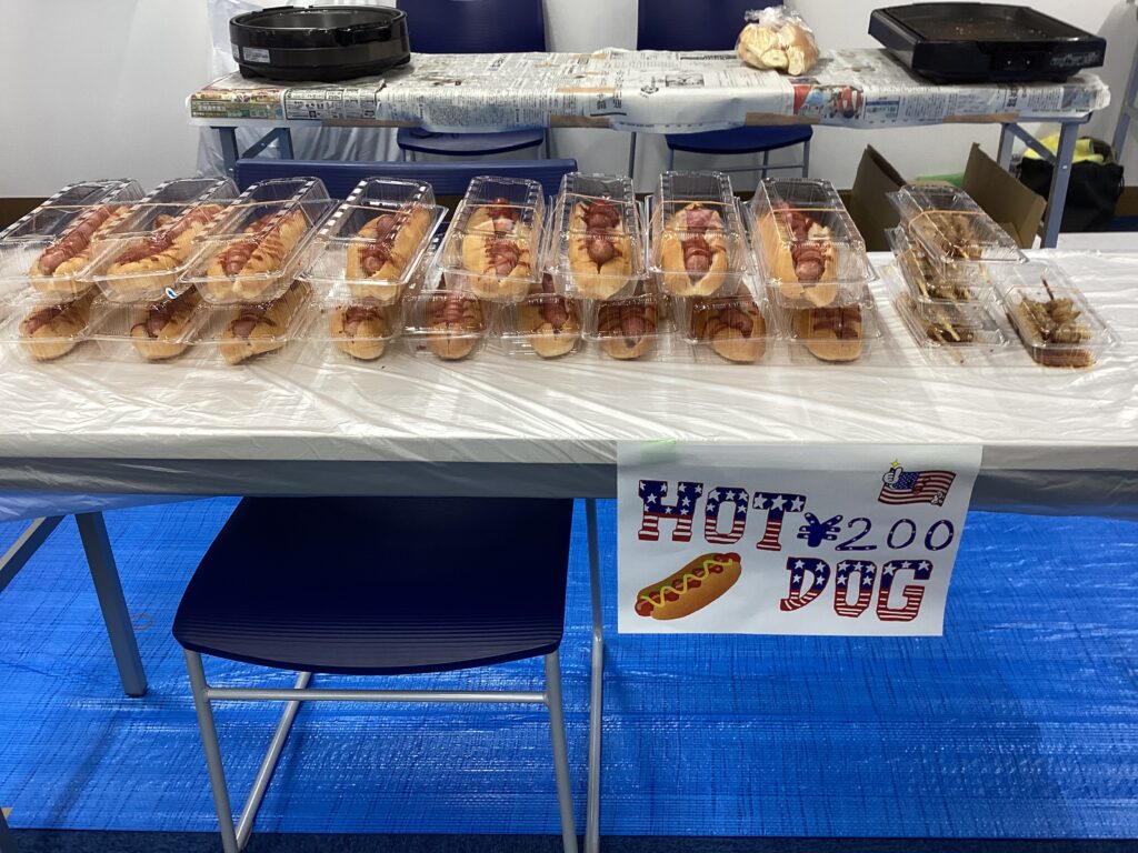 3年生は、焼き鳥やおにぎり、ポップコーンなどの模擬店を出店し、会場にはおいしそうな香りが広がりました。食事スペースも設けられ、来場者が食事や会話を楽しむ様子が見られました。